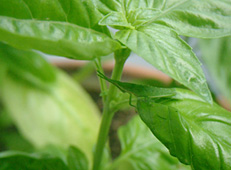 7/27. 訪問者:こんどはバッタが、バジルの葉を。。。