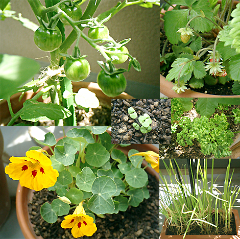 ミニトマト、バジル(まだ芽が出たばかり)、ワイルドストロベリー、パセリ、ナスタチウム。