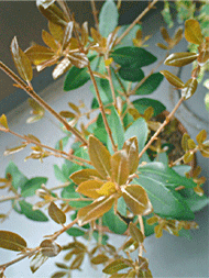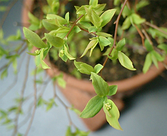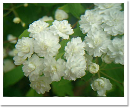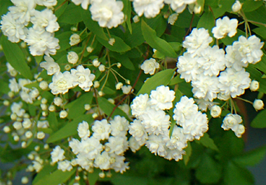 コデマリ(八重咲き) やっと咲きました。2年前に買って来た時、すでに花は終わっていて、枯れた花がらしかついてないちょっとみすぼらしい1鉢(だからすごく安かったんだけど)でした。去年は水切れでつぼみは全部おちてしまい、だから花を見るのは初めてです。今年は水に気をつけて大事に育ててきたので、ちょっと感激! |